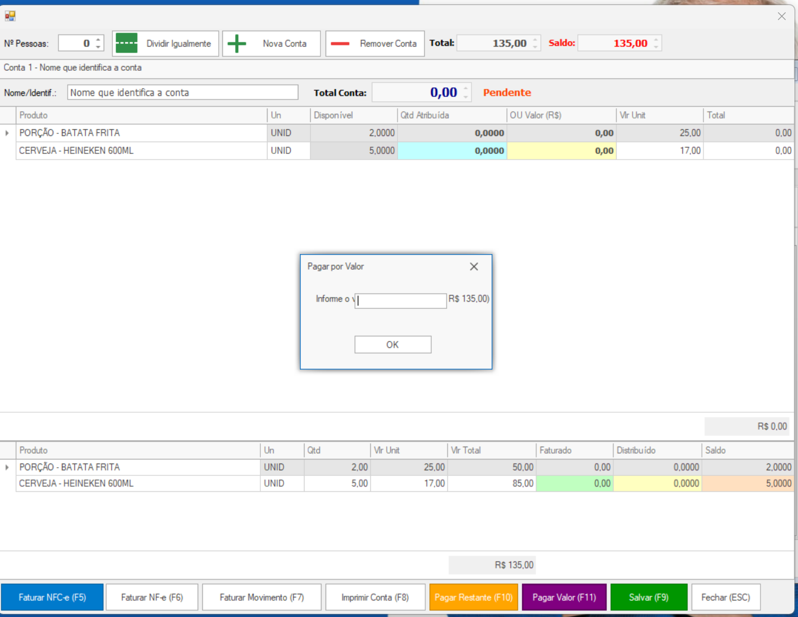 O botão Pagar Restante (F10) preenche automaticamente a conta selecionada com todo o saldo restante de cada produto da comanda.