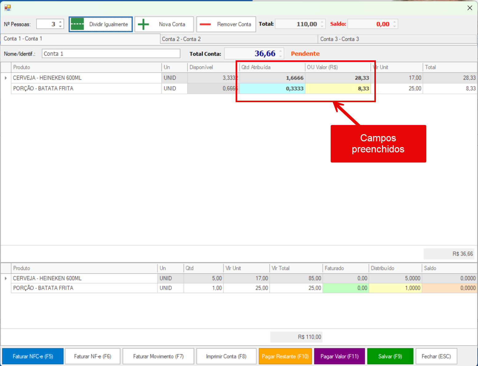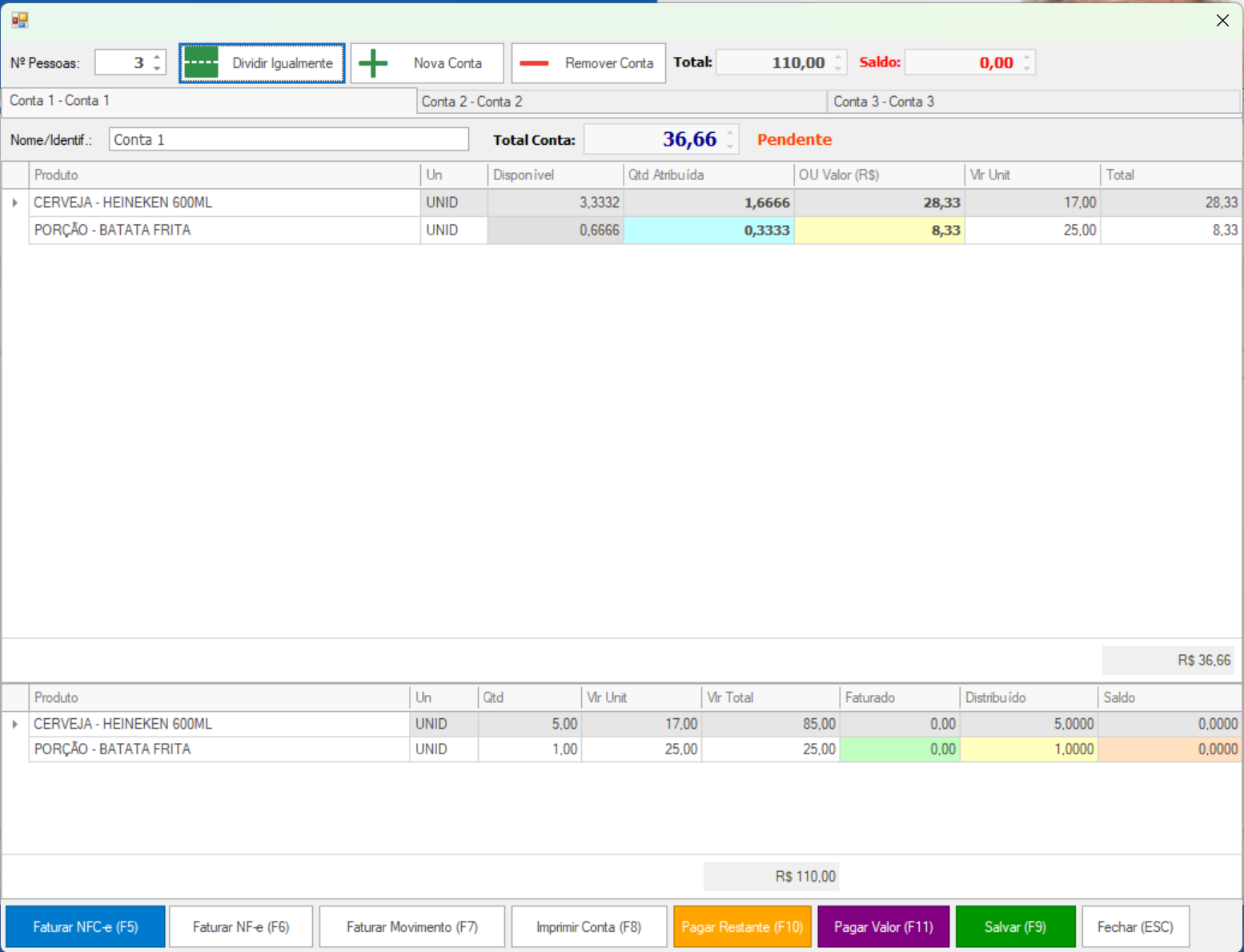 Cada conta pode ser faturada individualmente. O faturamento gera um documento fiscal (ou movimento) apenas com os produtos e quantidades atribuídos àquela conta específica.