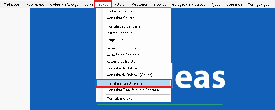 Para efetuar a transferência precisa acessar o Menu Banco e na opção de Transferência Bancária.