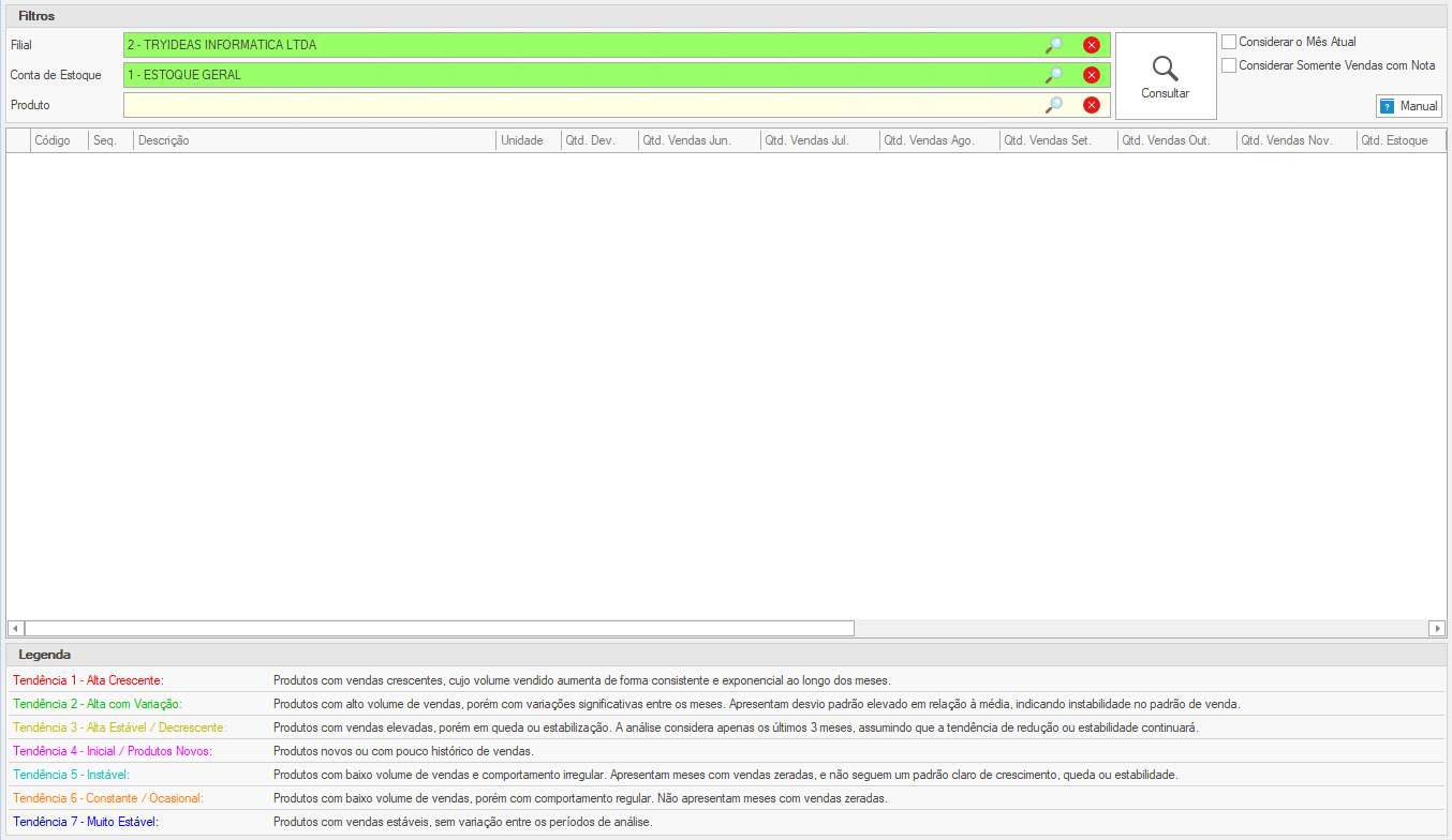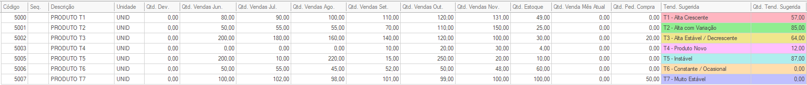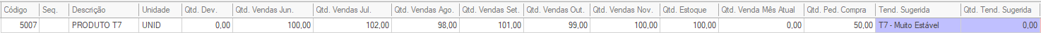- Qtd. Tend. Sugerida → conforme a tendência sugerida, a quantidade calculada pela sugestão será exibida.