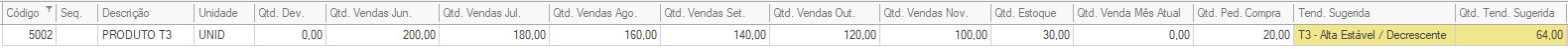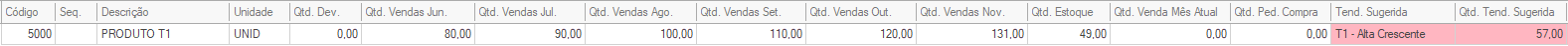 A sugestão do sistema pela Tendência 1 neste caso é devido ao crescimento constante nas vendas mês a mês. Estes podem ser classificado os produtos que tem potêncial de crescimento, recomendado inclusive a compra em quantidades até maiores que a sugerida.