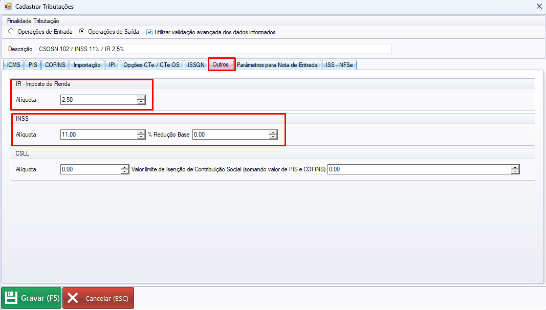 As tributações de INSS e IR sempre vão estar sempre na aba Outros dentro da Tributação.