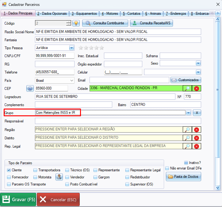 Na cadastro do parceiro, deve ser informado o Grupo Parceiro: